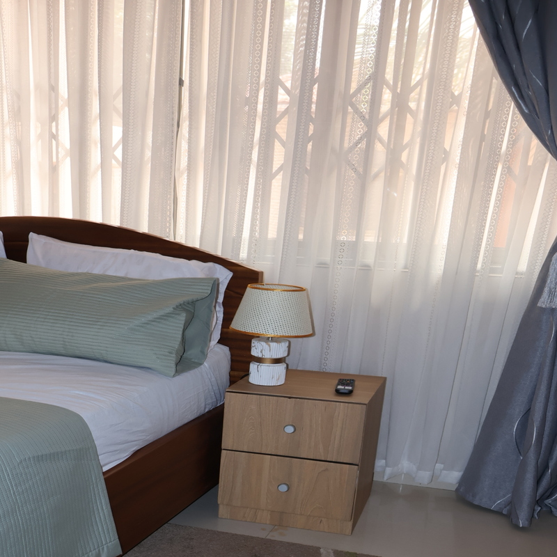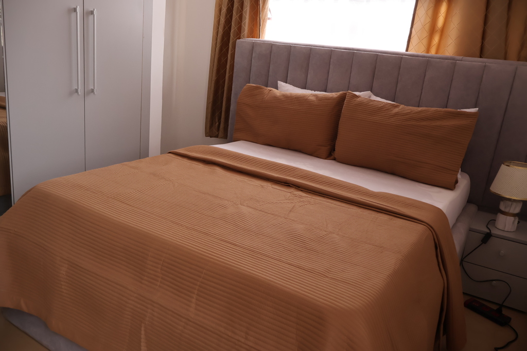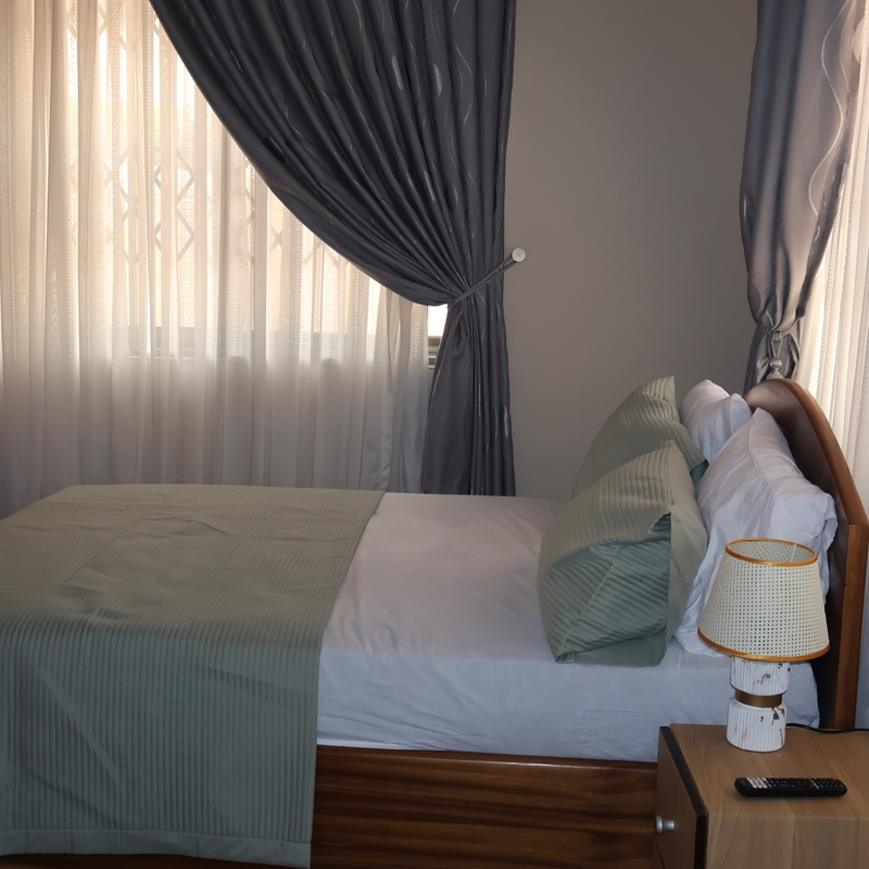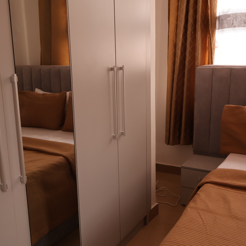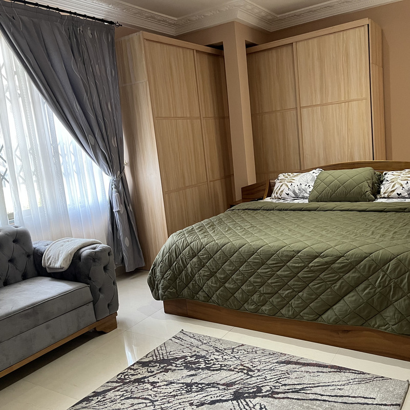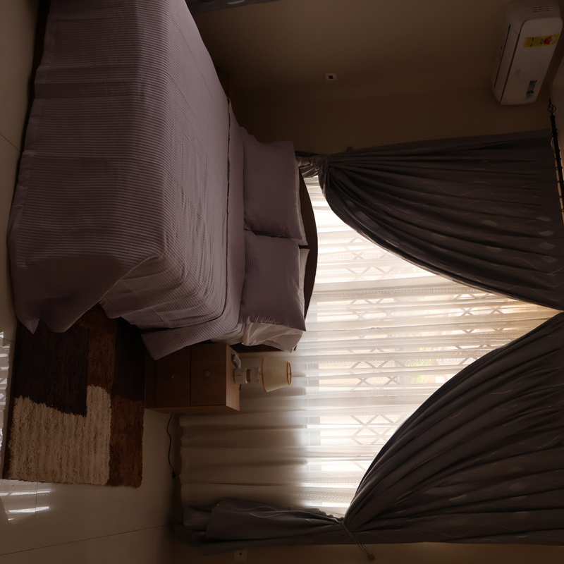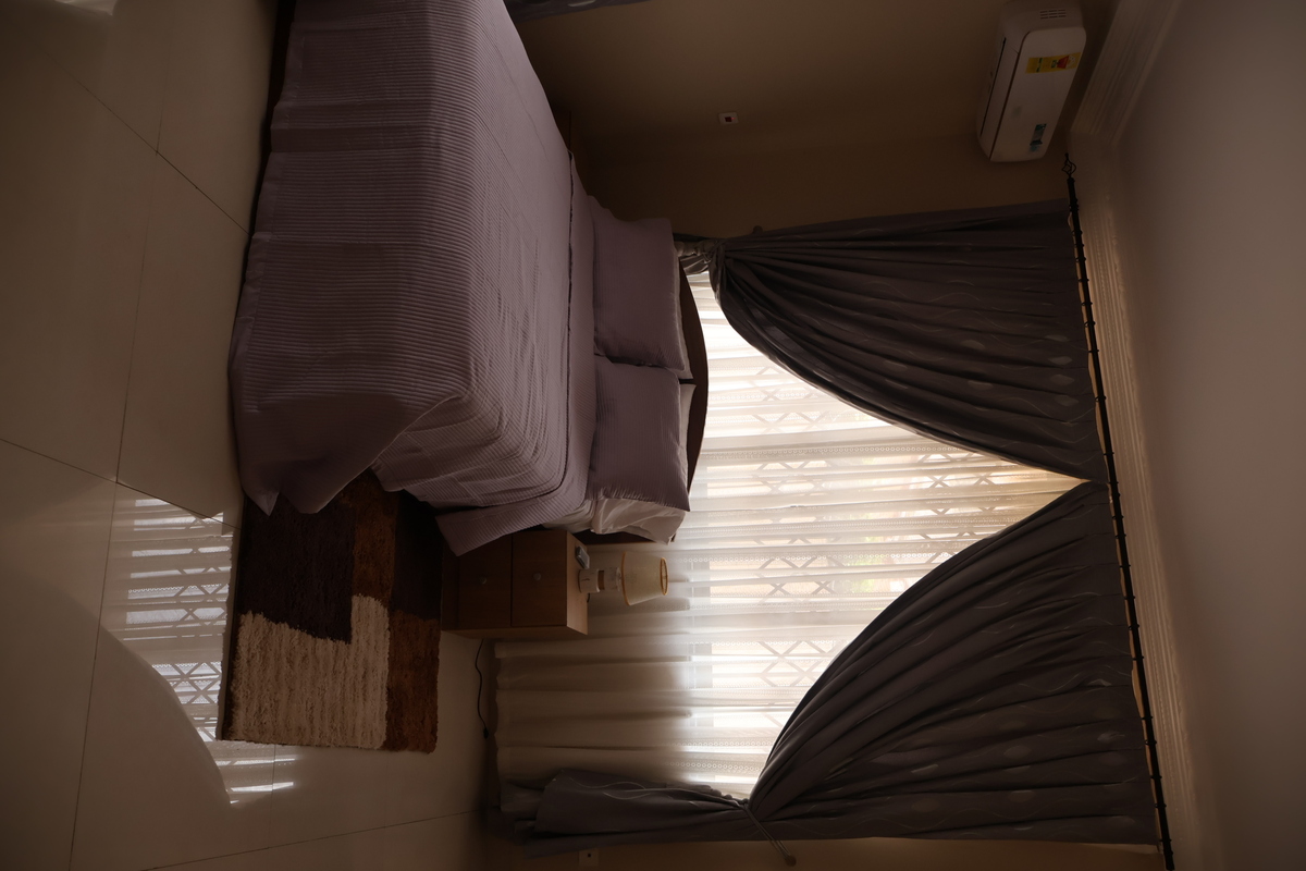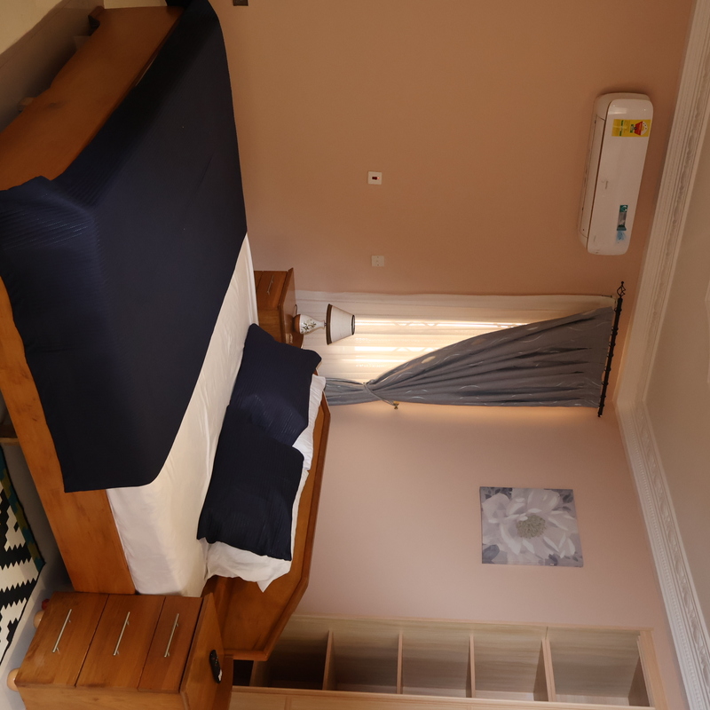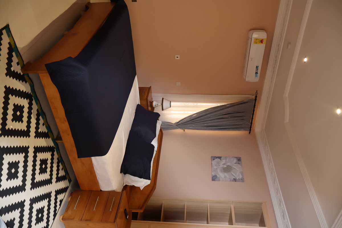 Enjoy comfort, privacy, and independence in this beautifully furnished self-contained outer house, ideal for both short and extended stays. The bedroom features a comfortable double bed with soft linens, bedside lighting, and a spacious wardrobe with mirrored panels, creating a relaxing and practical retreat. Large curtained windows fill the room with natural light while maintaining privacy, giving the space a warm and inviting feel.