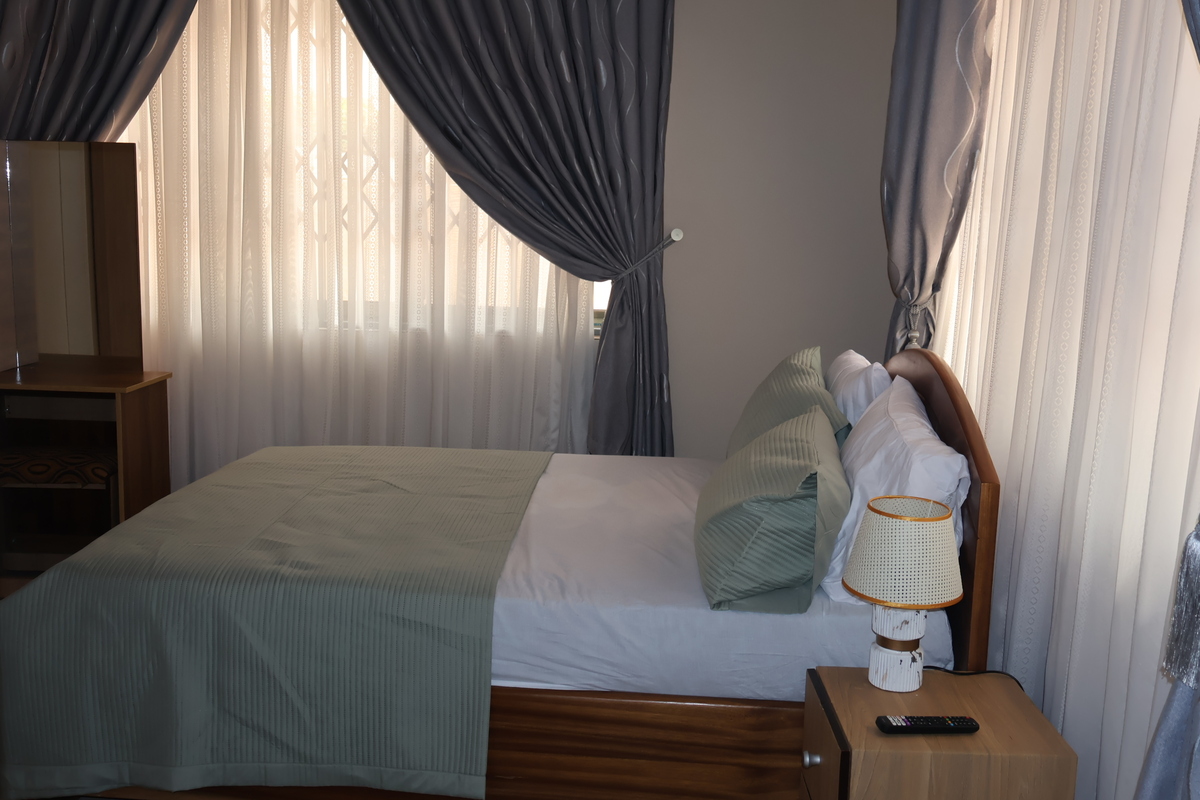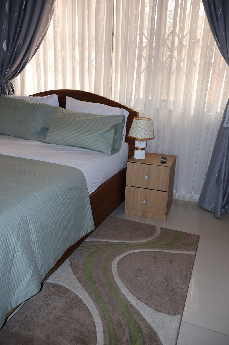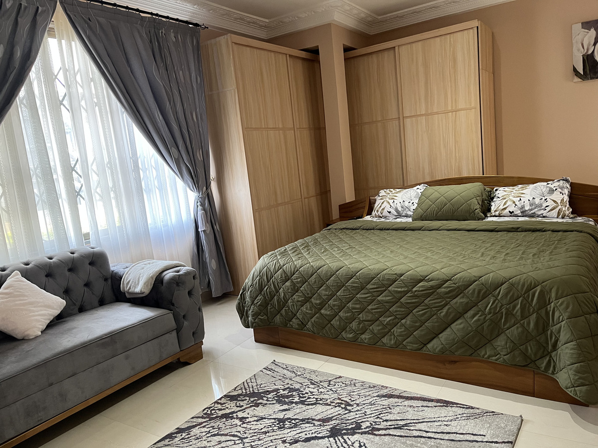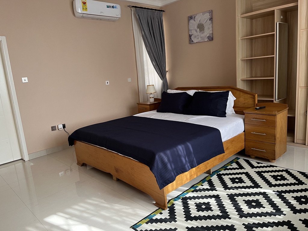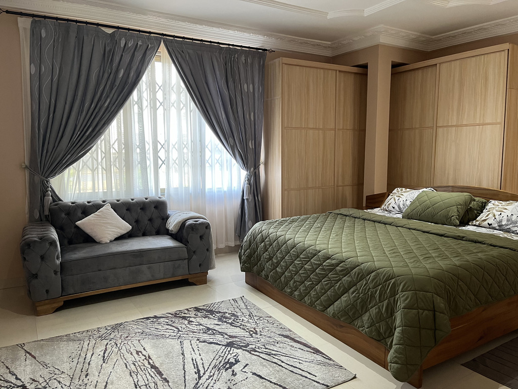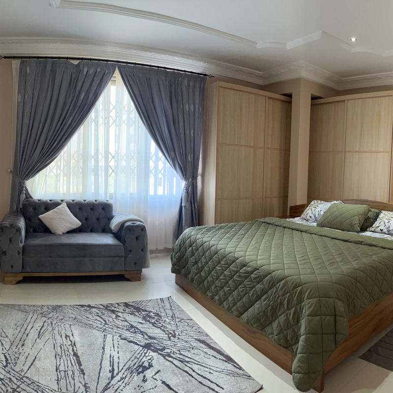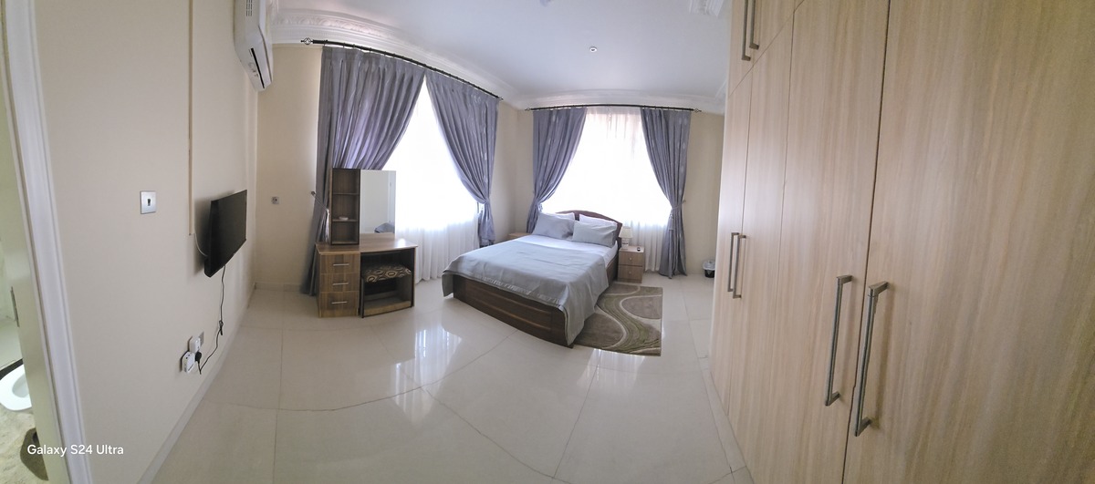 Enjoy comfort, privacy, and independence in this beautifully furnished self-contained outer house, ideal for both short and extended stays. The bedroom features a comfortable double bed with soft linens, bedside lighting, and a spacious wardrobe with mirrored panels, creating a relaxing and practical retreat. Large curtained windows fill the room with natural light while maintaining privacy, giving the space a warm and inviting feel.