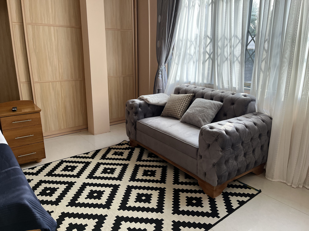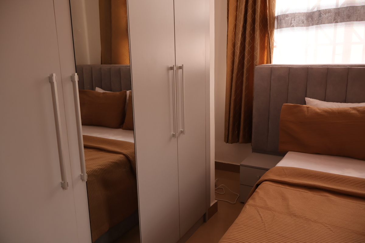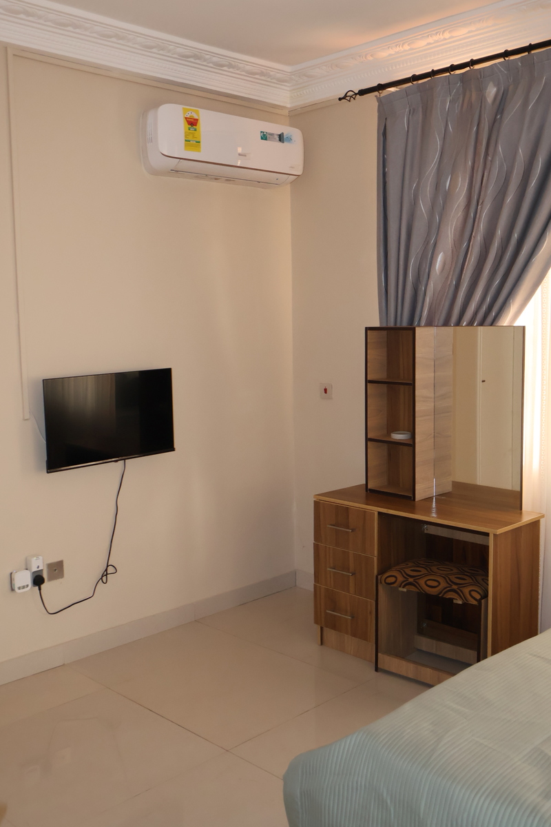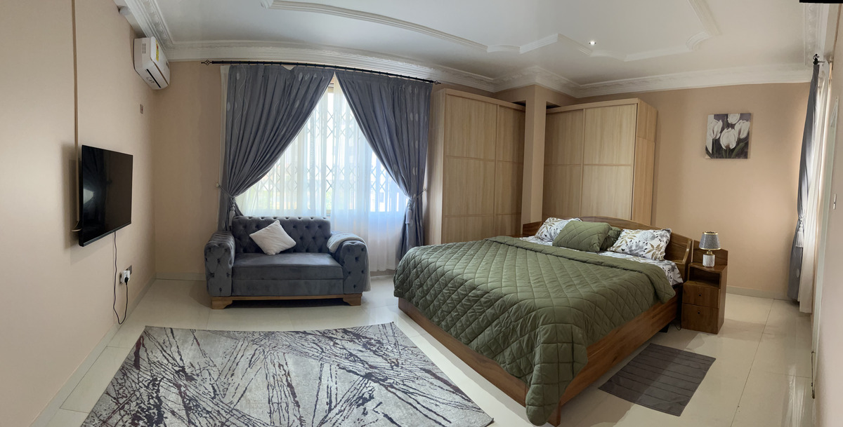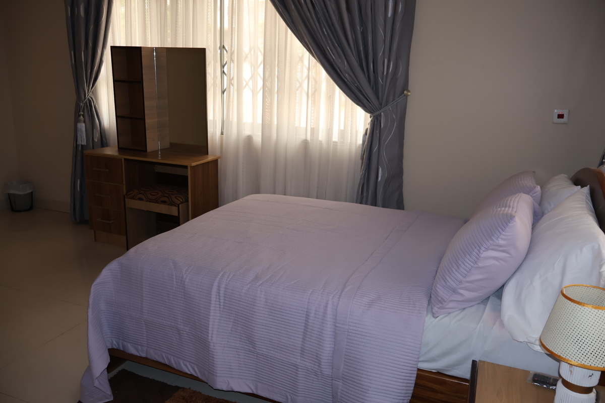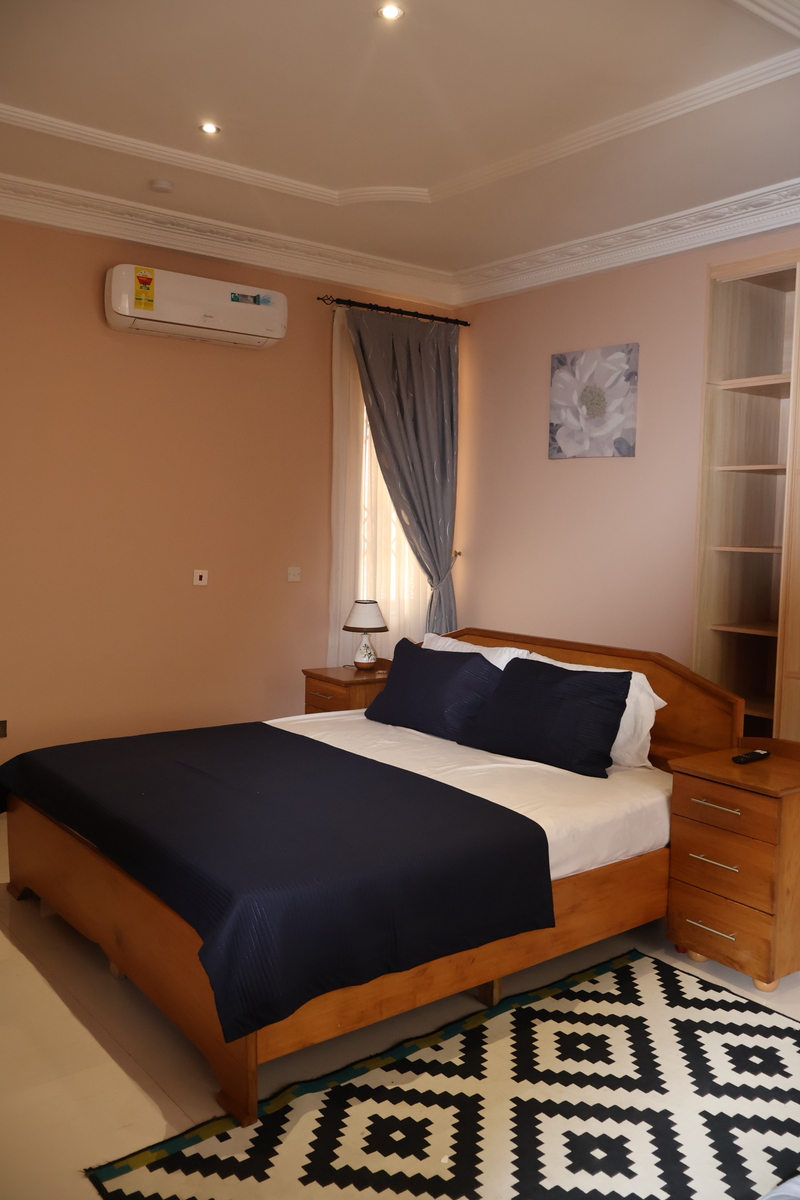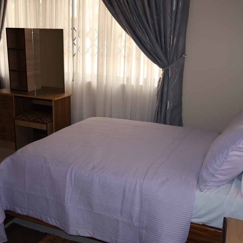 Enjoy comfort, privacy, and independence in this beautifully furnished self-contained outer house, ideal for both short and extended stays. The bedroom features a comfortable double bed with soft linens, bedside lighting, and a spacious wardrobe with mirrored panels, creating a relaxing and practical retreat. Large curtained windows fill the room with natural light while maintaining privacy, giving the space a warm and inviting feel.