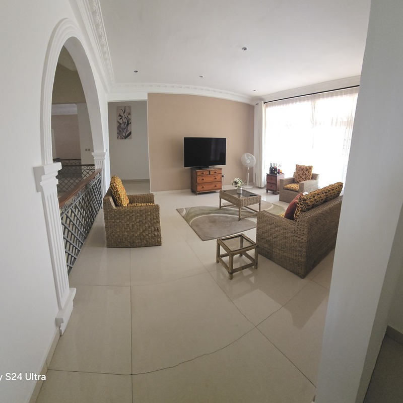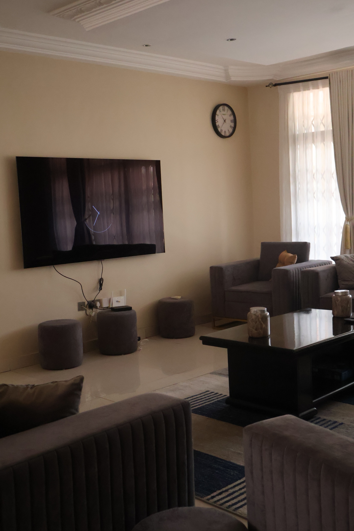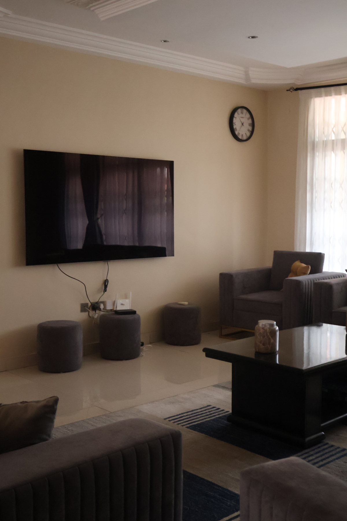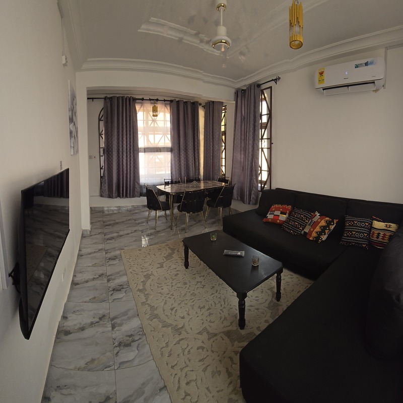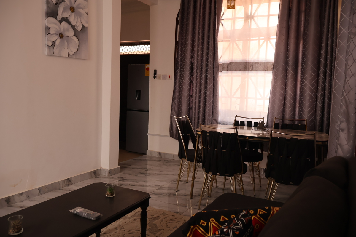 The living and dining area offers a cosy setting to unwind, complete with a comfortable sofa, coffee table, wall-mounted TV, and a stylish dining table perfect for meals or work. Elegant finishes, tiled flooring, and tasteful décor add a modern, homely touch throughout.